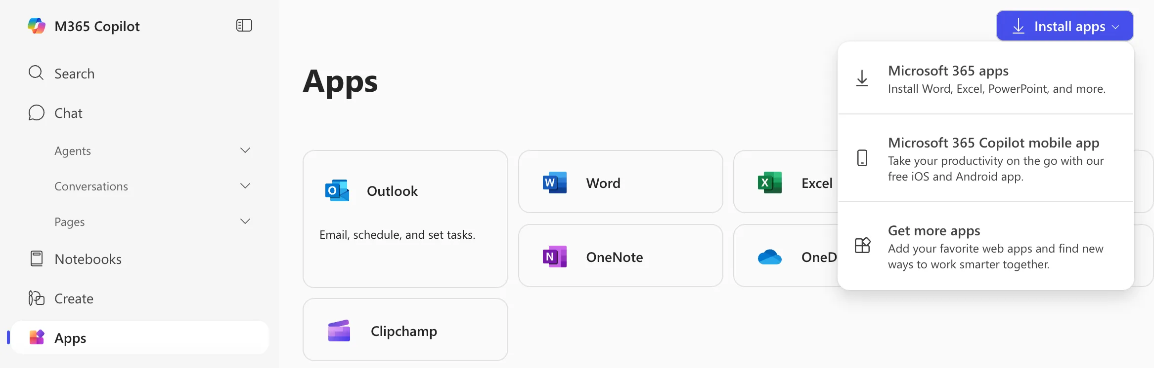 Click “Install apps” at the top right of the screen and then click “Microsoft 365 Apps” in the menu that appears.