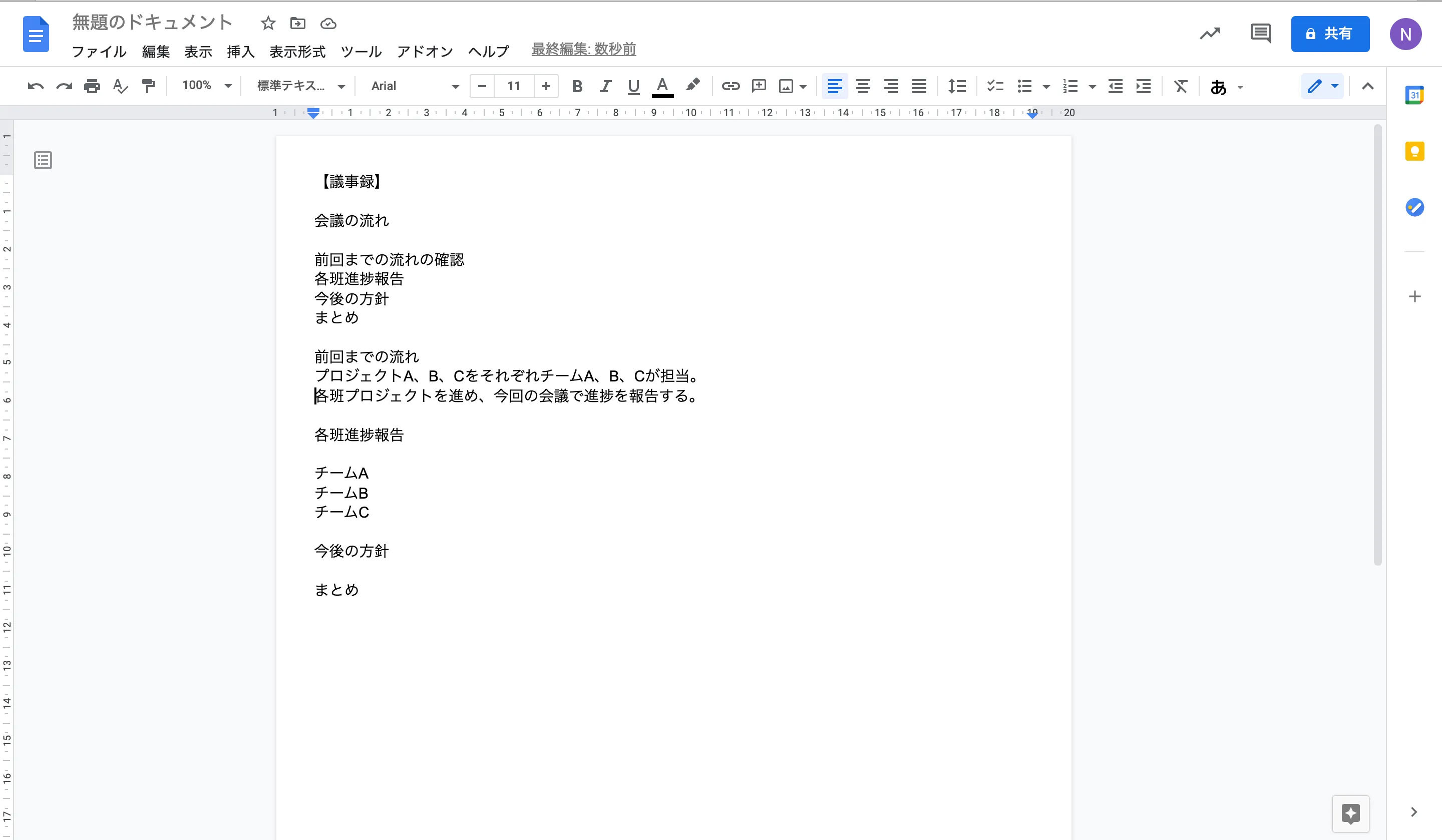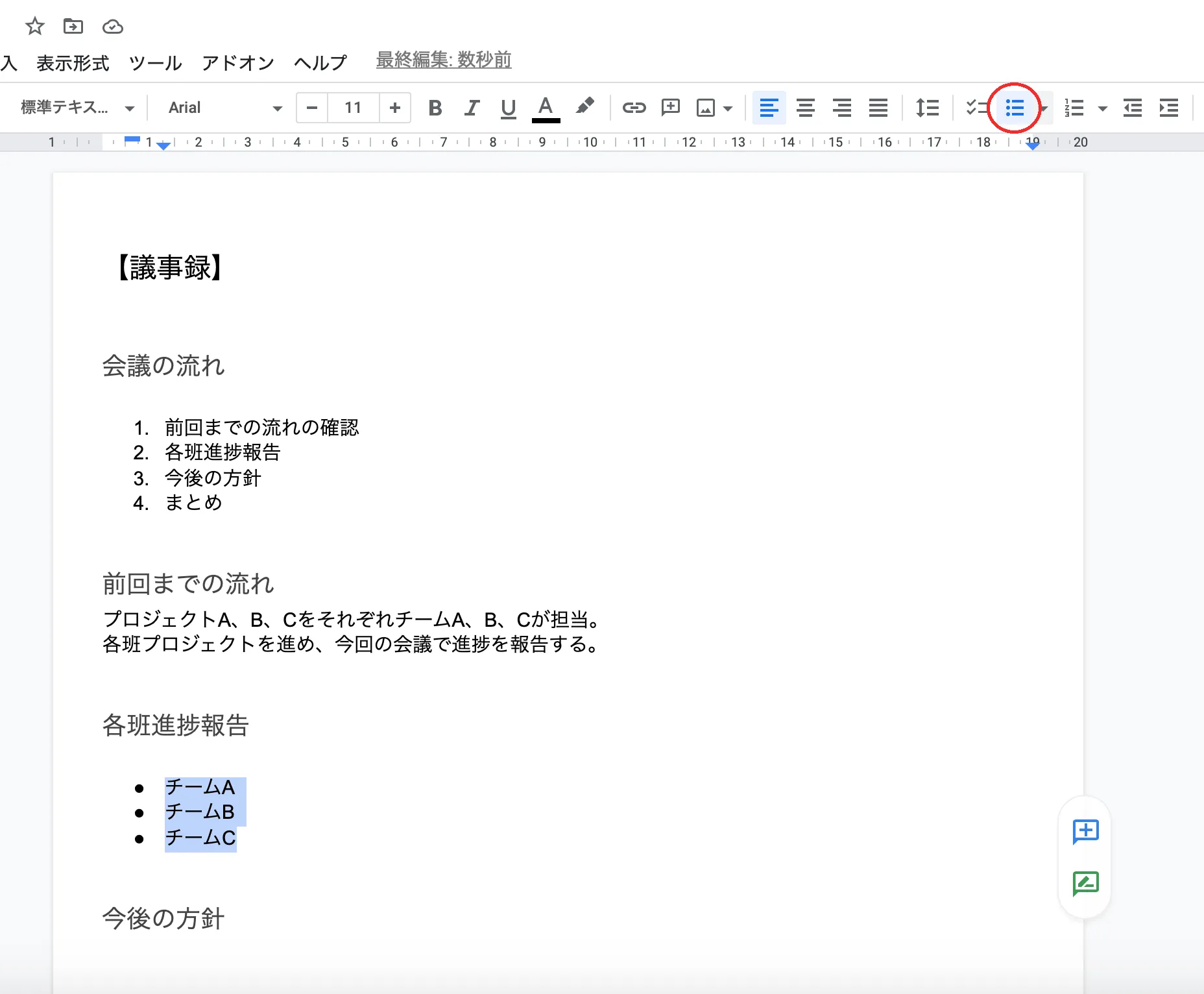 上の例では,「【議事録】」を「見出し2」に,「会議の流れ」「前回までの流れ」「各班進捗報告」「今後の方針」「まとめ」をそれぞれ「見出し3」に設定しました.