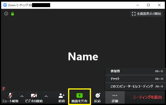 - ミーティングを退出 : ミーティングを退出します.押した後確認画面が出るため,ボタンを押したらいきなり退出するわけではありません.