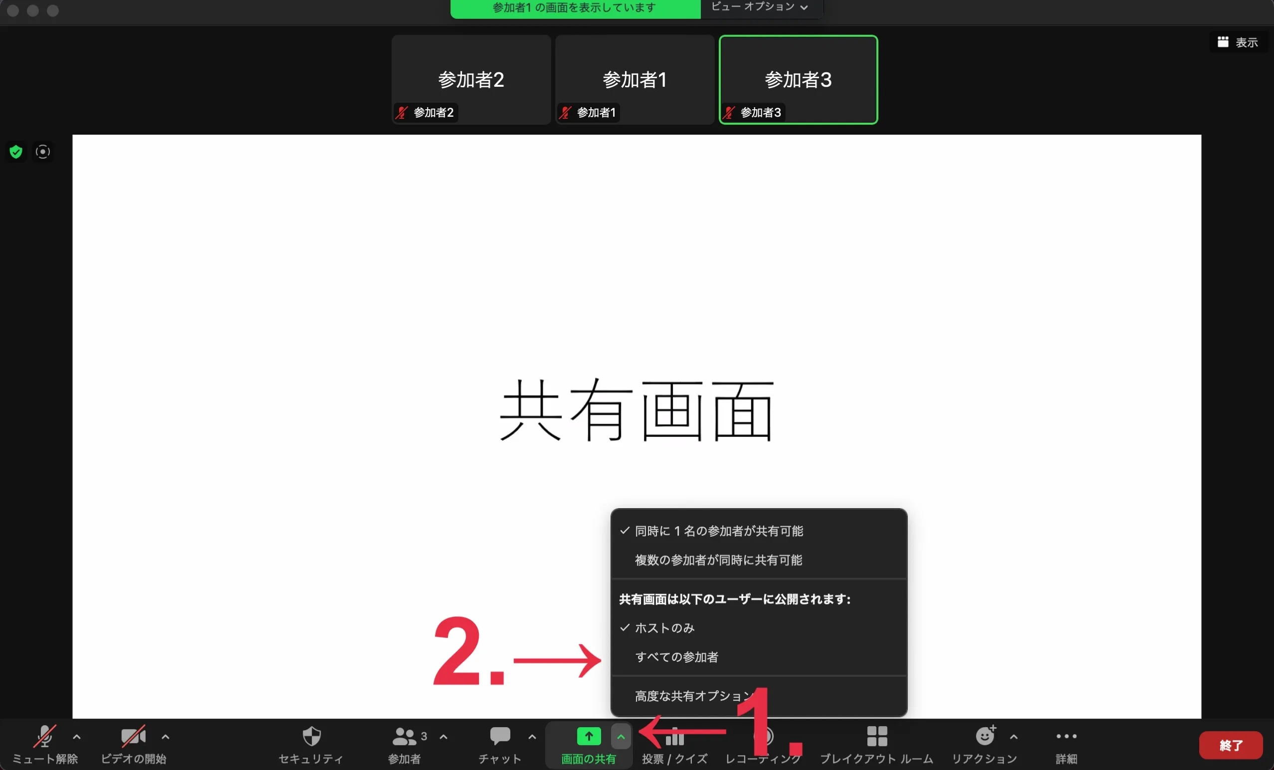 他の参加者への共有を終了したい場合には,上の画面で「ホストのみ」を押してください.