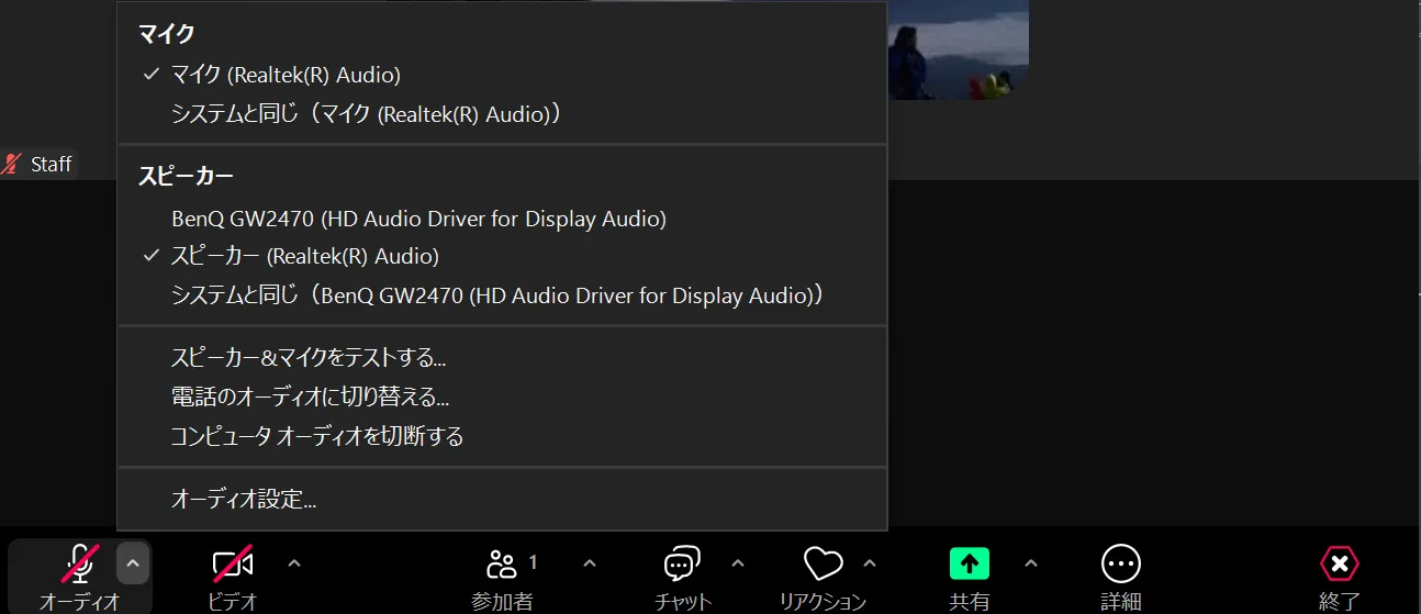 PCのZoomアプリでは,内蔵と外付けなど複数のスピーカーやマイクが接続されている場合,利用したいものを選択することができます.以下で設定方法を説明します.